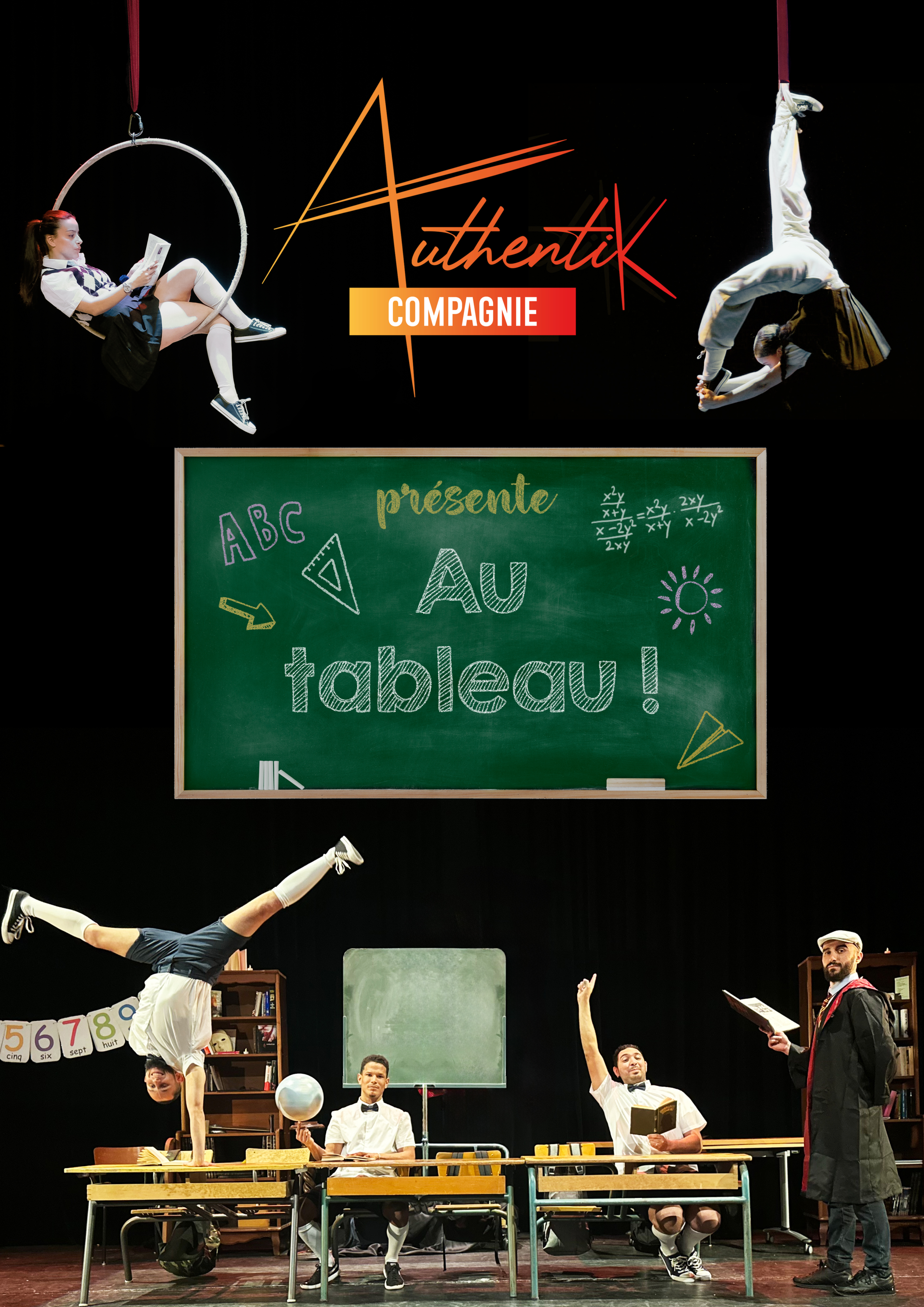 « Ring ring » la sonnette retentit, les élèves s’installent en classe. A chaque coup de crayon, une magie se dessine. Les objets et la salle de classe deviennent un terrain de jeux. Accompagné de leur professeur principal, chaque élève dépasse ses limites pour obtenir la meilleure note. Une course s’engage alors, avec une philosophie : ensemble on va plus loin. « Au tableau ! » un spectacle tout en humour et poésie, qui mêle cirque, danse et acrobatie.